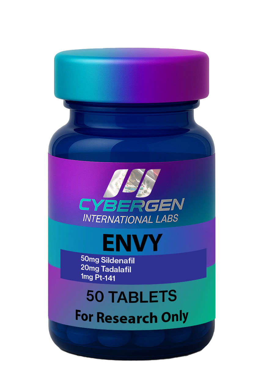 ENVY is a combined research formulation that pairs two peripheral PDE-5 pathway agents (sildenafil + tadalafil) with PT-141, a centrally acting melanocortin receptor agonist peptide. In controlled research settings, this combo is explored for how vascular perfusion signaling and CNS arousal signaling may interact in sexual-health pathway models.